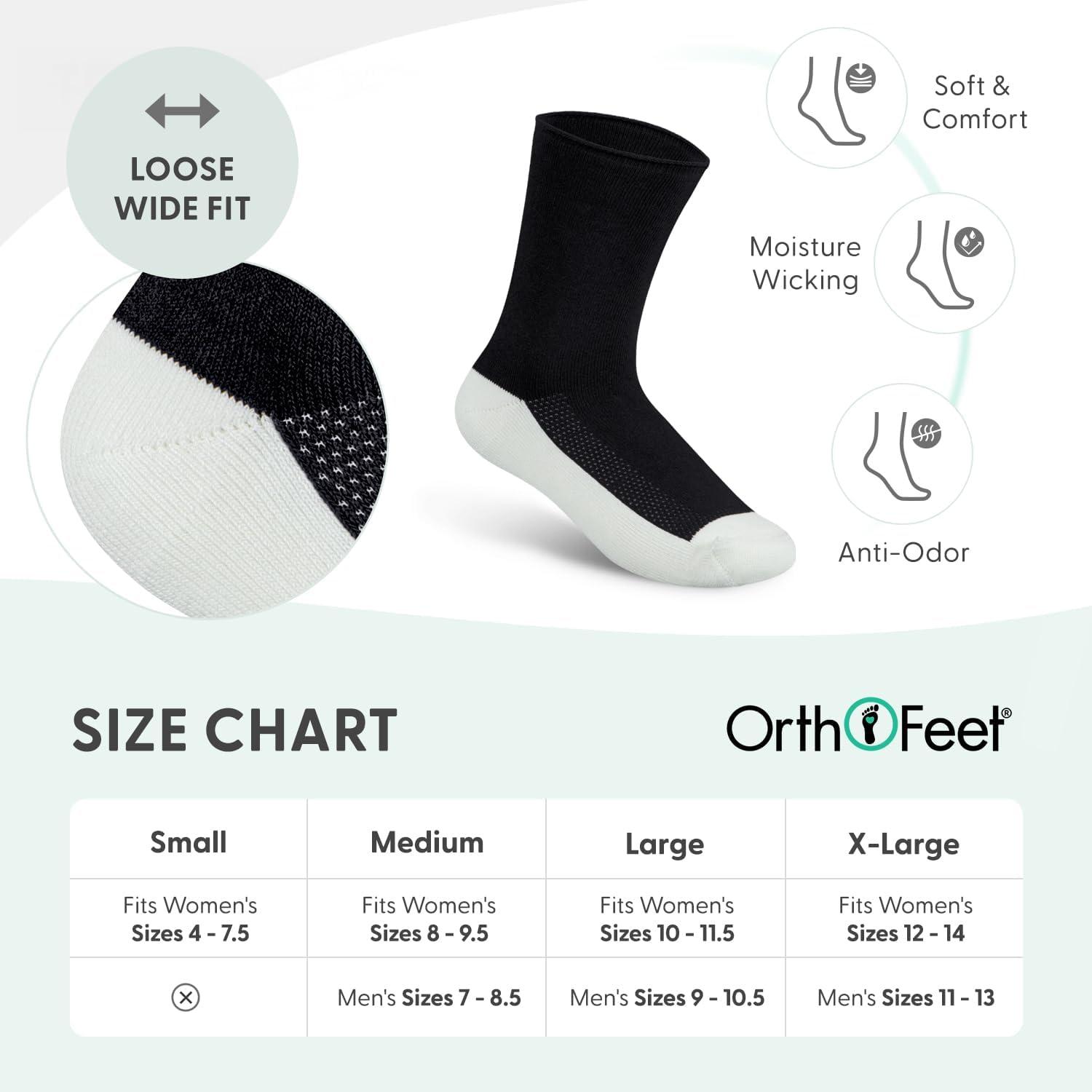 BioSoft(TM) Extra Roomy socks for women and men by Orthofeet feature non-constrictive, seam-free design, excellent moisture wicking system, and soft cushioning interior that offer unsurpassed comfort and protection for sensitive feet and for those with circulatory problems and edema. FIT: Designed for shoes with extra room, and normally don’t fit dress shoes. SIZES: SMALL SOCKS: fit women's sizes 4 – 7; MEDIUM SOCKS: fit women's sizes 7.5 – 10 and men's sizes 6 – 8.5; LARGE SOCKS: fit women's sizes 10.5 – 13 and men's sizes 9 – 11.5; EXTRA LARGE SOCKS: fit men's sizes 12 – 15; WASHING: Machine wash, warm like colors, tumble dry low. Do not use fabric softeners or chlorine bleach.