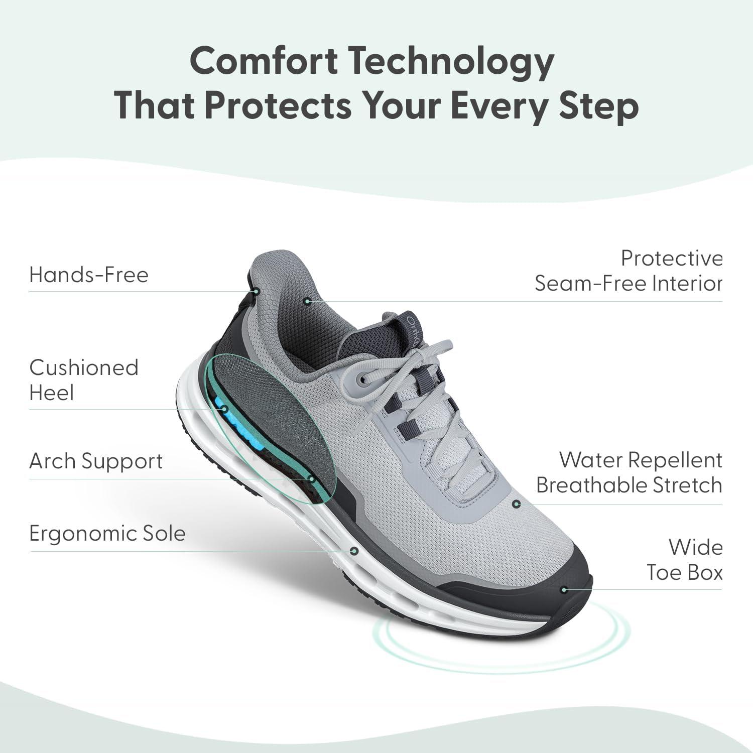 Step up your active life and protect your mobility with Journey, featuring our OFX Hands Free tech, so you can slip them on without bending down. A breathable stretch upper contours to your foot in motion, for minimal pressure. Put your comfort ahead of the curve with the heel-to-toe pain relief of the Ortho-Cushion System, including an ergonomic max cushion sole.