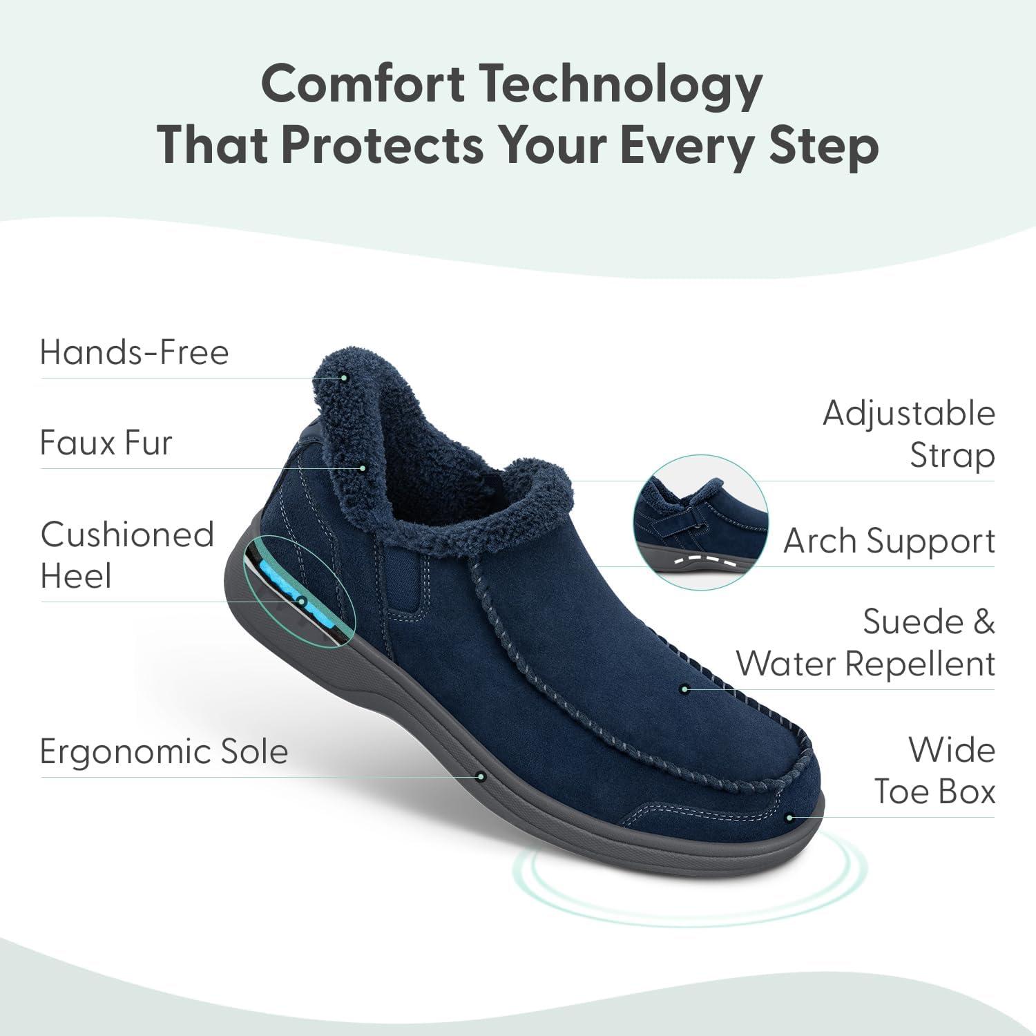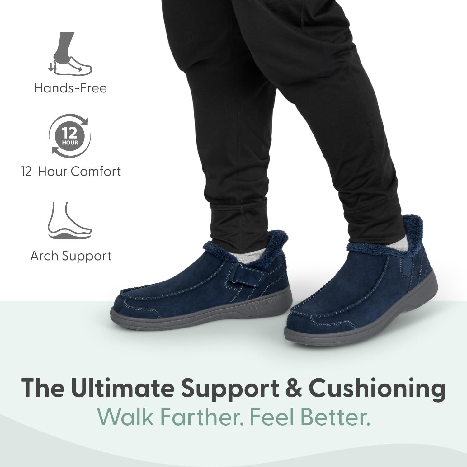 This hands-free, water-repellent, lightweight, orthopedic walking slipper provides full support and cushion all day long, while allowing extra room in the toe area, and a comfortable fit with suede leather fabric.