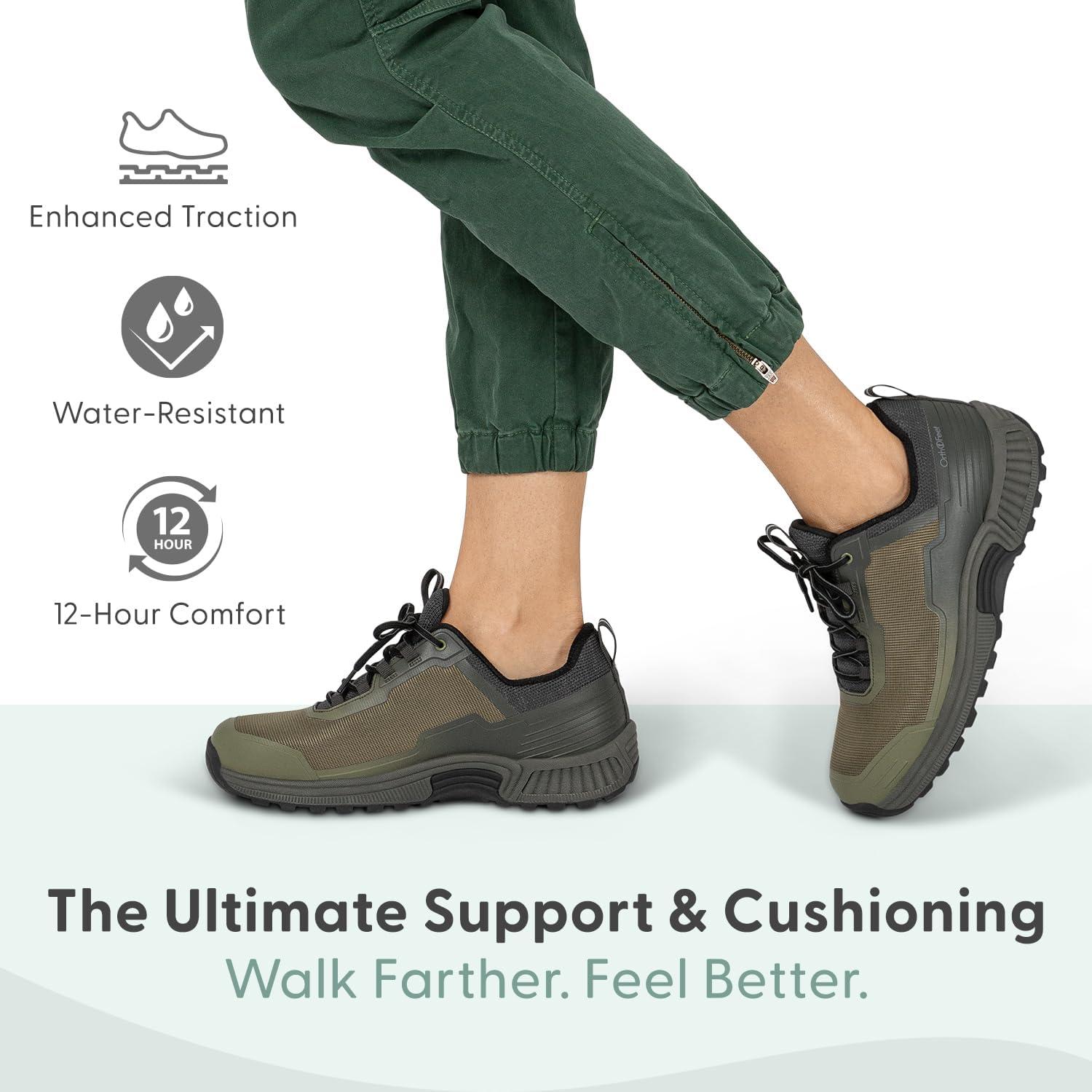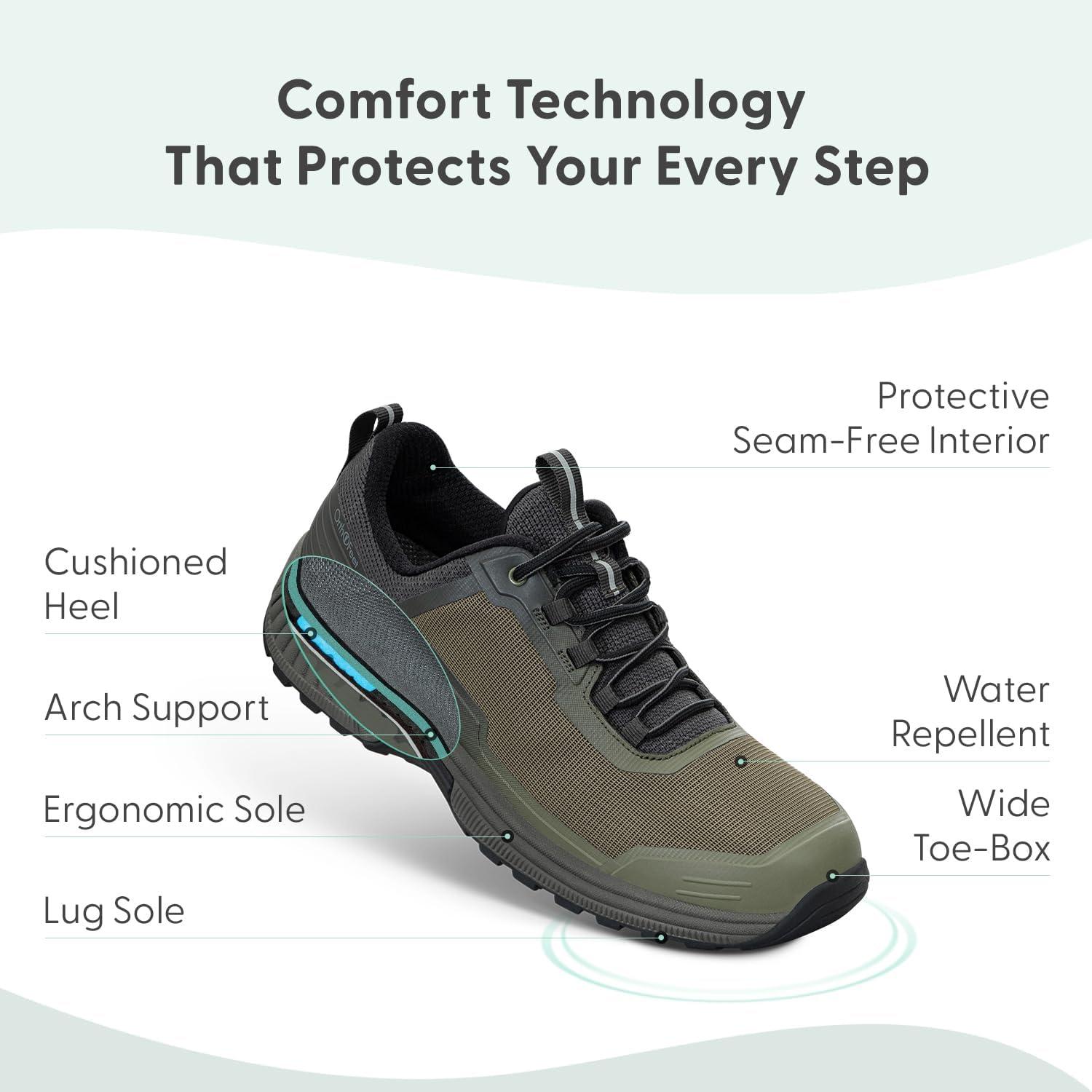 This lightweight, outdoor, orthopedic hiking shoe provides full support and cushion all day long, while allowing extra room in the toe area, and a comfortable fit.