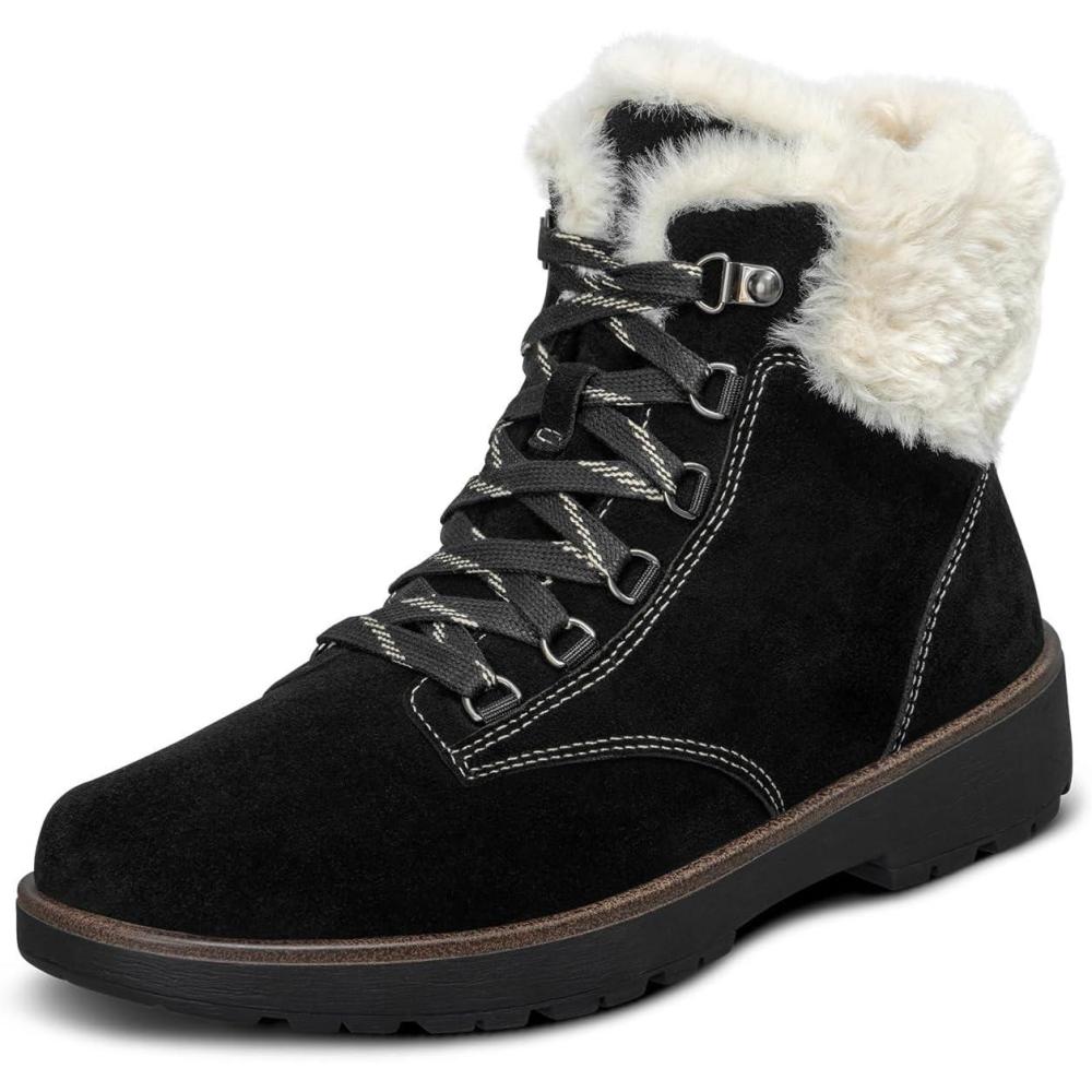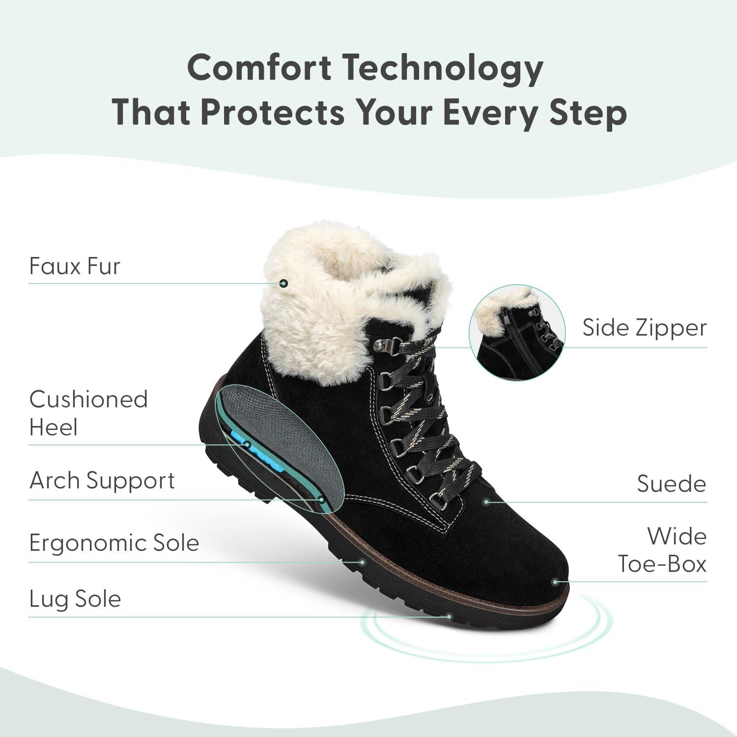 Experience every height in our stylish, water-resistant, soft suede alpine hiking boot. Stella also keeps feet warm, wrapping ankles in cozy faux fur. Enjoy the pain-free walking benefits of the Ortho-CushionTM System in a distinctive block heel and lug sole design. With a protective interior offering ample space and adjustability, sensitive feet find unmatched comfort, wherever you go.